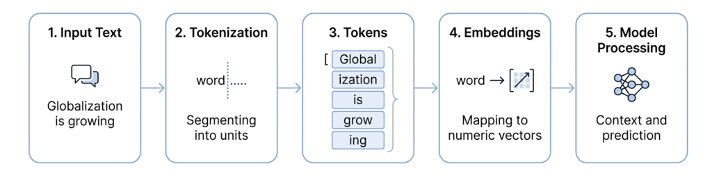 - Efficient vocabulary management – Instead of storing millions of full words, models operate with a manageable vocabulary (typically ~30K–100K tokens).